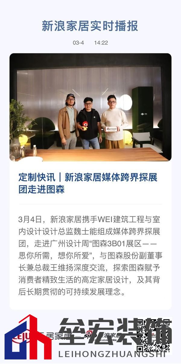 ??新浪定制家居訊 3月4日,新浪家居攜手WEI建筑工程與室內(nèi)設(shè)計(jì)設(shè)計(jì)總監(jiān)魏士能組成媒體跨界探展團(tuán),走進(jìn)廣州設(shè)計(jì)周“圖森3B01展區(qū)——思你所需,想你所愛(ài)”,與圖森股份副董事長(zhǎng)兼總裁王維揚(yáng)深度交流,探索圖森賦予消費(fèi)者精致生活的高定家居設(shè)計(jì),及其背后長(zhǎng)期貫徹的可持續(xù)發(fā)展理念。