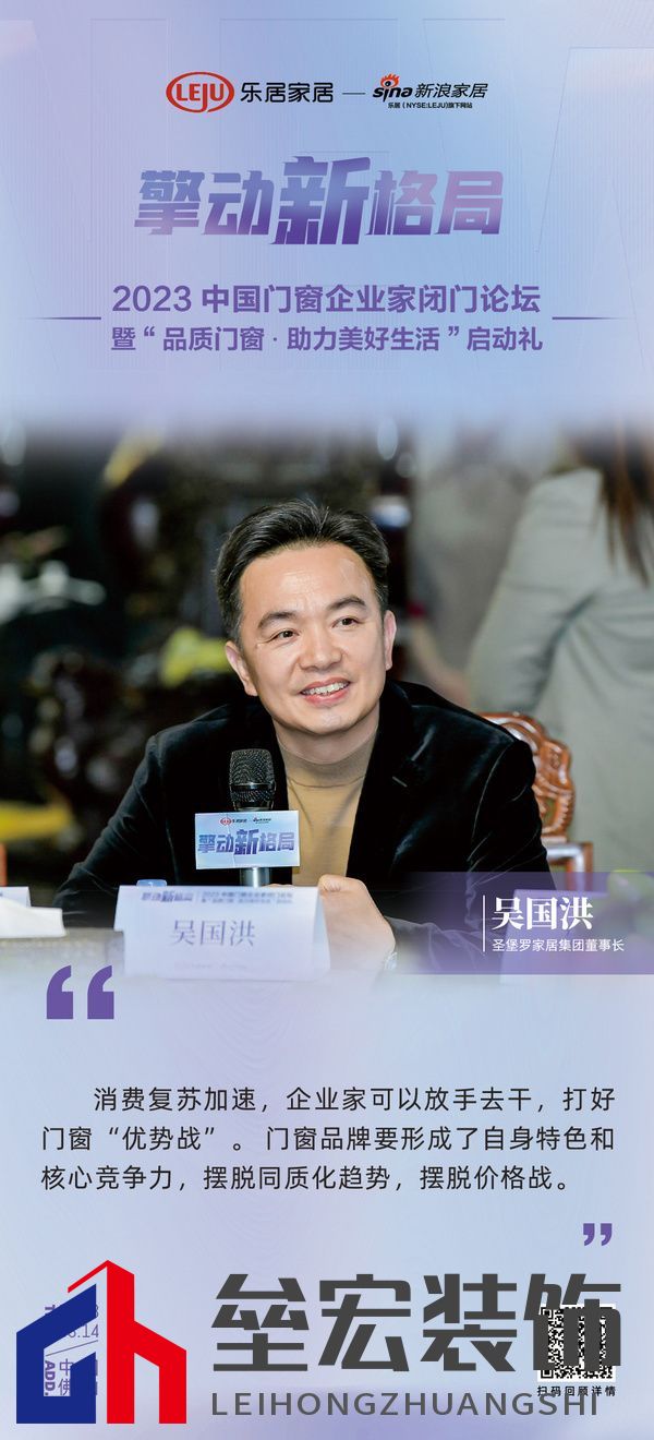 ??新浪門窗頻道訊 3月14日,“擎動(dòng)新格局”2023中國門窗企業(yè)家閉門論壇暨“品質(zhì)門窗·助力美好生活”啟動(dòng)禮在中國佛山舉行。由新浪家居門窗行業(yè)總經(jīng)理葉玲菊主持,圍繞行業(yè)發(fā)展趨勢,與新浪家居總經(jīng)理冀靜、新豪軒門窗董事長馮文波、派雅門窗董事長李鈞洪、皇派門窗董事長朱福慶、軒尼斯門窗總裁曾慶偉、億合門窗董事長曾奎、圣堡羅家居集團(tuán)董事長吳國洪、百利瑪門窗董事長黃維壽、德技優(yōu)品門窗董事長雷少軍、富軒全屋門窗董事長李昌安、博仕門窗董事長王湘根、高登鋁業(yè)集團(tuán)執(zhí)行總裁李婧、歐迪克門窗董事長冷洪熙、富奧斯門窗副董事長賀杰雄、美沃門窗董事長洪長林、伊盾門窗董事長張龍偉、榮高門窗董事長黃榮高、漢獅百葉董事長鄧揚(yáng)禮、薩洛凱門窗董事長吳國強(qiáng)、美詩固門窗董事長詹緬陽、新豪軒門窗總裁馮佐星、新標(biāo)家居集團(tuán)總裁助理黃子鋒、阿爾卑斯系統(tǒng)門窗總經(jīng)理常寶琛、金凱德門窗總經(jīng)理代超等,20+中國門窗行業(yè)優(yōu)秀企業(yè)家,展開一場集深度、高度、廣度、熱度的私享交鋒,為行業(yè)高質(zhì)量發(fā)展獻(xiàn)言獻(xiàn)策。