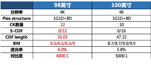 (98吋與100吋屏幕具體參數(shù)) 在屏幕生產(chǎn)中,液晶面板并不是簡單切割成對應(yīng)尺寸大小的面板,實際生產(chǎn)過程中涉及到面內(nèi)設(shè)計、工藝制程等諸多工序。 面內(nèi)設(shè)計是指屏幕切割前,于玻璃基板內(nèi)進行連線、電路等精密設(shè)計。其中,衡量面內(nèi)設(shè)計是否優(yōu)秀相對重要的指標(biāo)是充電率和開口率。 充電率越高,畫面色彩均勻性更好。而其中CK(時鐘線)數(shù)量影響充電率,CK越多,色彩均勻性越高;CK越少,色彩均勻性相對較低。98吋屏幕的CK數(shù)量比100吋屏幕要多,由此98吋屏幕的色彩均勻性、對比度都要比100吋的屏幕更好。 開口率越高,透光率越高,亮度、對比度即越高,同時更節(jié)能。98吋屏幕開口率可達6%,100吋屏幕只有5.8%,所以98吋屏幕的明亮表現(xiàn)更好,也更節(jié)能。更重要的是,98吋對比度也比100吋更好。 目前電視工藝制程方面,98吋面板的技術(shù)最為成熟,總產(chǎn)線也最多,共有11條生產(chǎn)線,生產(chǎn)水平與質(zhì)量有保障;制作100吋面板的技術(shù)不屬于主流生產(chǎn)技術(shù),僅有8條產(chǎn)線,技術(shù)不成熟的同時,產(chǎn)線產(chǎn)能也相對分散。由此也可知,98吋技術(shù)成熟,易維護;而100吋技術(shù)目前尚未完善,屬于非主流技術(shù),發(fā)展趨勢并不明朗,后期配件更換等維護難度更大。