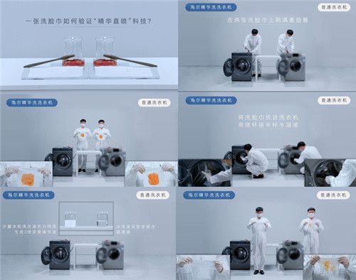 贏在科技:海爾洗衣機原創(chuàng)“精華直噴”科技,3倍濃度的精華液瞬間滲透衣物,從而使面巾紙上的污漬完全洗凈,潔凈如新。