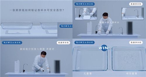 贏在科技:海爾凈水機原創(chuàng)“鮮活水2.0”科技,首杯鮮活即飲,這樣的過濾效果使得被純水浸泡的廚房紙上無菌落。