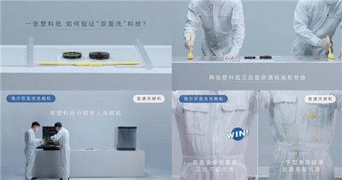 贏在科技:海爾洗碗機原創(chuàng)“雙面洗”科技,實現(xiàn)上下雙向噴淋,從而使塑料紙毫無油污殘留,正反兩面都干凈。