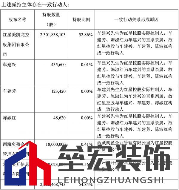 ??截至公告披露之日,紅星美凱龍家居集團(tuán)股份有限公司(以下簡稱“公司”)控股股東紅星美凱龍控股集團(tuán)有限公司(以下簡稱“紅星控股”)持有公司2,301,838,103股,約占公司總股本的52.86%,紅星控股及其一致行動(dòng)人合計(jì)持有公司2,388,468,743股股份(全部為無限售條件流通股),約占公司總股本的54.85%。 |