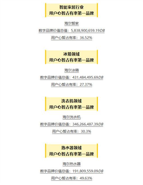 伴隨著農(nóng)耕取代狩獵采集,人類開始定居生活,自此有了家的概念。古之民“陵阜而居,穴而處”,刻著簡(jiǎn)陋壁畫的洞穴就是他們的家;杜甫盼望“得廣廈千萬(wàn)間”,不為秋風(fēng)所破的茅屋就是他的家;劉禹錫喜歡“調(diào)素琴、閱金經(jīng)”,一間陋室便是他的家;陶淵明“心遠(yuǎn)地自偏”,車馬喧囂的地方也能定居安家。 到了現(xiàn)代,人們對(duì)“家”有了更具象的概念,對(duì)美好生活的向往,無(wú)不體現(xiàn)在對(duì)家的種種設(shè)想上。從House到Home的躍遷,既包含了每個(gè)人對(duì)何謂舒適、溫馨、安全的個(gè)性化定義,也離不開科技為基座的硬核加持。2015年,海爾智家就在行業(yè)內(nèi)率先提出“智慧家庭”的愿景和戰(zhàn)略,這是一家企業(yè)與用戶所凝聚的高度共識(shí):既有這家全球化企業(yè)多年來(lái)對(duì)智慧家庭的深度理解和趨勢(shì)引領(lǐng),也是用戶對(duì)未來(lái)之家的主流期待和場(chǎng)景想象。 時(shí)間終會(huì)獎(jiǎng)勵(lì)辛勤耕作者。在『數(shù)字品牌榜』發(fā)布的2022年DBRank100:數(shù)字品牌價(jià)值年度榜上,海爾智家以58億DB成為智能家居行業(yè)用戶心智占有率第一品牌,在該行業(yè)內(nèi)的用戶心智占有率高達(dá)36.52%,超過(guò)了美的(18.49%)+格力(11.95%)+方太(2.49%)+三星(2.39%)+LG(0.49%)+博西家電(0.44%)等多個(gè)也在該方向發(fā)力的中外企業(yè)——榜女郎溫馨提醒一下:這不是對(duì)“家電企業(yè)”的評(píng)價(jià),而是反映了在用戶心目中誰(shuí)才是“最智慧家庭”品牌的認(rèn)知。 同時(shí),海爾智家也在冰箱、洗衣機(jī)、熱水器等多個(gè)細(xì)分領(lǐng)域內(nèi),獲得用戶心智占有率第一品牌的位置。如下: