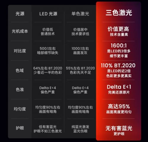 ??售價(jià)不低依然被買爆的背后,說明中國的高技術(shù)含量產(chǎn)品在國外也可以獲得很好的盈利能力,Made in China不再停留在低價(jià)低技術(shù)含量的刻板印象中。另一方面也是向全世界的用戶宣告,中國高科技不止停留在衛(wèi)星與航母這樣的星辰大海領(lǐng)域,早已經(jīng)滲透到了普通人的生活中,可以說堅(jiān)果成功進(jìn)行了文化輸出。 ??目氪?三色激光光機(jī)全面領(lǐng)先LED ??從奧斯卡大咖到國內(nèi)影人,從職業(yè)影人到海內(nèi)外廣大消費(fèi)者,堅(jiān)果投影既能獲得專業(yè)資深人士的認(rèn)證,又能或得廣大消費(fèi)者的認(rèn)可,這實(shí)屬不易。而這份不易的背后是堅(jiān)果對技術(shù)的執(zhí)著,對于產(chǎn)品的信念,以及對為用戶負(fù)責(zé)的態(tài)度。 ??堅(jiān)果投影深諳三色激光投影優(yōu)于LED,盡管做好三色激光投影的難度巨大,但還是義無反顧的選擇了那條最難的路。為了做好三色激光投影儀,堅(jiān)果工程師團(tuán)隊(duì)從最核心的光源開始研發(fā),歷時(shí)三年自研出了MALC 目氪?三色激光光機(jī),一舉解決了三色激光成本高、體積大、有散斑這三座大山。 ??三座大山的背后,凝聚了堅(jiān)果投影多項(xiàng)核心技術(shù)。首先,MALC 目氪?三色激光光機(jī)通過模組化激光堆疊技術(shù),解決掉了傳統(tǒng)光機(jī)體積大、成本高等問題,再通過首創(chuàng)的LSR動態(tài)消散斑專利技術(shù),又解決掉了三色激光投影儀的散斑問題。此外,該三色激光光機(jī)還支持400分區(qū)四層復(fù)眼勻光系統(tǒng),讓投影畫面均勻度超過95%,從而讓它的亮度和色彩顯示效果更精準(zhǔn)。因?yàn)檫@些技術(shù)的運(yùn)用,才讓三色激光投影能夠與更多的消費(fèi)者見面。