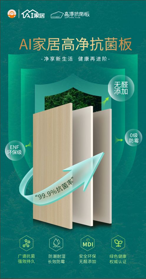 ??AI家居高凈抗菌板,作為集“無醛添加、抗菌、防霉”三重守護(hù)力于一體的環(huán)保板材,是品牌為廣大消費(fèi)者打造健康整家新防線,積極推進(jìn)國家兒童友好空間體系建設(shè)的拳頭產(chǎn)品。從原材料的選取、基材成型,到裁板切割、封邊貼面,生產(chǎn)過程不添加甲醛物質(zhì),真正實(shí)現(xiàn)無甲醛添加。