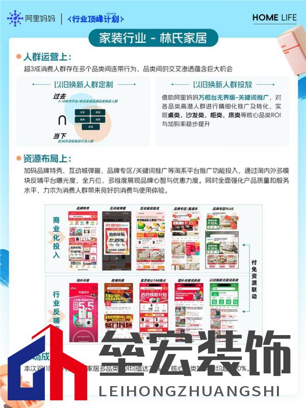 ??林氏家居: ??以舊換新人群科學(xué)定制:5-10年內(nèi)平臺(tái)/品牌品類(lèi)購(gòu)買(mǎi)人群&近30天目標(biāo)類(lèi)目行為人群。 ??借助阿里媽媽萬(wàn)相臺(tái)無(wú)界版-關(guān)鍵詞推廣,對(duì)各品類(lèi)高潛人群進(jìn)行精細(xì)化推廣及轉(zhuǎn)化,桌類(lèi)、沙發(fā)類(lèi)、柜類(lèi)、床類(lèi)等核心品類(lèi)ROI與加購(gòu)率穩(wěn)步提升。