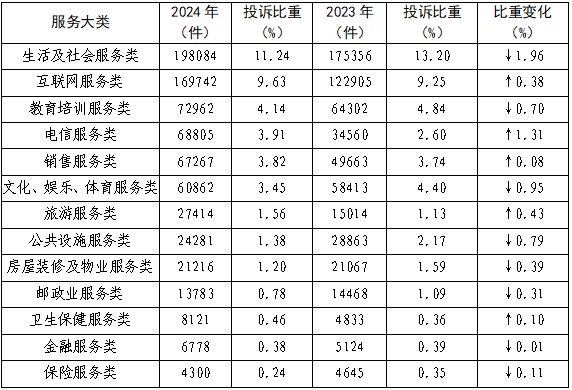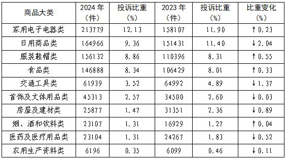 2月6日,中國消費者協(xié)會發(fā)布2024年全國消協(xié)組織受理投訴情況統(tǒng)計結(jié)果。 2024年全國消協(xié)組織共受理消費者投訴1761886件,比上年增長32.62%,解決1211284件,投訴解決率68.75%,為消費者挽回經(jīng)濟損失12.8億元。 商品大類方面,家用電子電器類、房屋及建材類投訴量居前十位。其中,家用電子電器類投訴量高達213779件,為投訴量最多的商品,投訴比重為12.13%, 同比投訴比重上升0.23個百分點。另外,房屋及建材類2024年投訴量25877件,占投訴比重1.47%,相較2023年下降0.89個百分點,投訴量排名第七。 商品大類投訴量圖(單位:件) 商品大類投訴量變化表 根據(jù)服務(wù)大類投訴數(shù)據(jù)顯示,房屋裝修及物業(yè)服務(wù)投訴量居第九位,為21216件,投訴比重為1.20%,同比投訴比重下降0.39%。 服務(wù)大類投訴量圖(單位:件) 服務(wù)大類投訴量變化表 在具體商品投訴中,家具類2024年投訴量為33822件,相較2023年上升20.95%,位居商品細分領(lǐng)域投訴排名的第七位。 商品細分領(lǐng)域投訴前十位(單位:件) 投訴量居前十位的商品(單位:件)