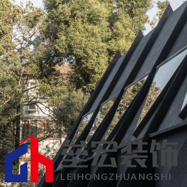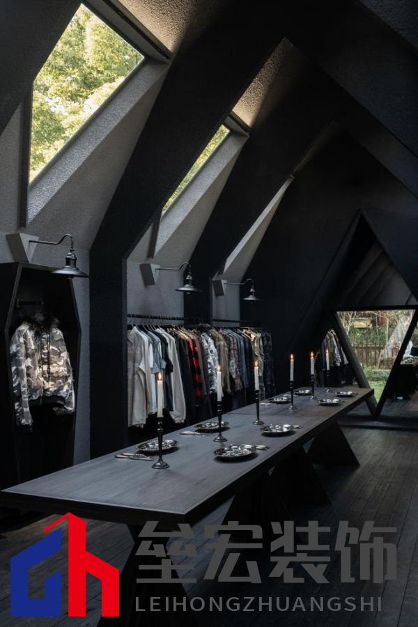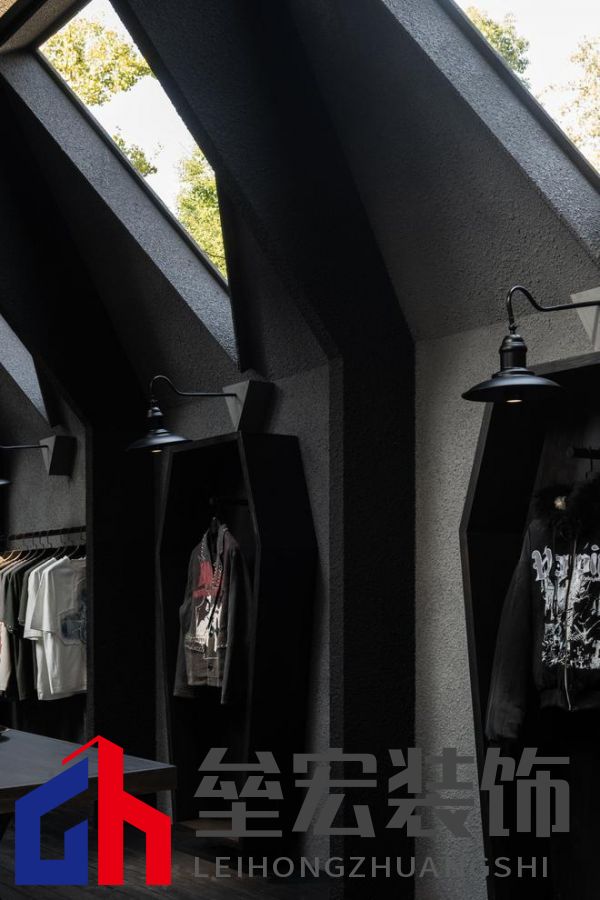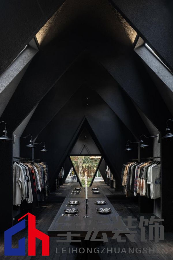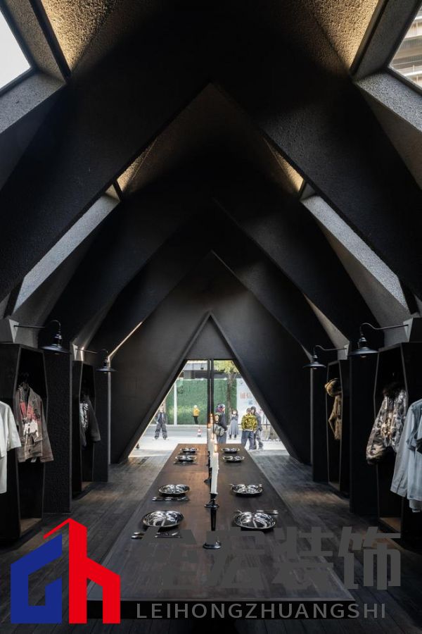 三角形斜頂天窗引入外部自然光,使暗調(diào)建筑在不同時間中呈現(xiàn)微妙的光影變化,也模擬了服裝面料中金屬涂層光澤。這一手法不僅回應(yīng)著 “光明”與“黑暗”間的矛盾張力,也象征著品牌在沉靜與爆發(fā)中尋找到的獨特平衡。