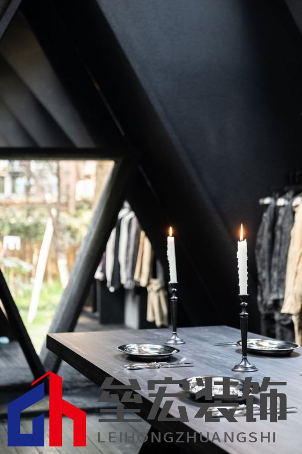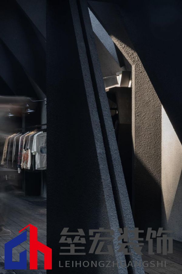步入內(nèi)部,展陳系統(tǒng)亦延續(xù)品牌的設(shè)計邏輯:懸掛裝置模擬布料垂墜的動勢,陳列木盒的棱角呼應(yīng)服裝剪裁的鋒利線條。從宏觀空間到微觀產(chǎn)品,觀者皆能感知敘事的延續(xù),建筑形態(tài)與產(chǎn)品細(xì)節(jié)相互交融,使人與空間建立更深的情感聯(lián)結(jié)。