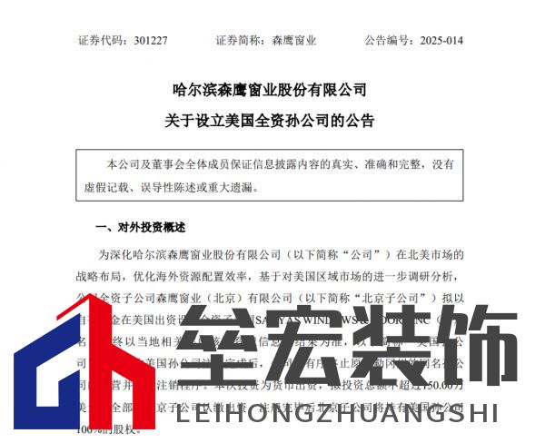 2月25日,森鷹窗業(yè)(301227.SZ)發(fā)布公告稱,為深化公司在北美市場的戰(zhàn)略布局,優(yōu)化海外資源配置效率,基于對美國區(qū)域市場的進一步調(diào)研分析,公司全資子公司森鷹窗業(yè)(北京)有限公司(簡稱“北京子公司”)擬以自有資金在美國出資設(shè)立全資子公司SAYYAS WINDOWS & DOORS INC(暫定名,最終以當(dāng)?shù)叵嚓P(guān)部門核準(zhǔn)登記信息的結(jié)果為準(zhǔn),簡稱“美國孫公司”)。 本次美國孫公司注冊完成后,公司將有序終止原俄勒岡州的同名孫公司的運營并申請注銷程序。本次投資為貨幣出資,擬投資總額不超過150.00萬美元,全部由北京子公司認繳出資,注冊完畢后北京子公司將持有美國孫公司100%的股權(quán)。 針對設(shè)立全資孫公司的目的,森鷹窗業(yè)表示,主要是基于公司對美國區(qū)域市場的進一步調(diào)研分析,對美國公司架構(gòu)進行戰(zhàn)略調(diào)整。本次美國孫公司擬設(shè)立在休斯頓市,休斯頓作為美國第四大城市及重要交通樞紐,建筑相關(guān)企業(yè)聚集,墨西哥灣沿岸區(qū)位優(yōu)勢顯著,在市場基礎(chǔ)、地理位置、物流成本及營商環(huán)境等方面更具綜合性優(yōu)勢,有利于美國孫公司更好的進行市場拓展,獲取客戶及合作伙伴,加快本土化運營進程,進而促進公司在北美市場的整體戰(zhàn)略布局。 |