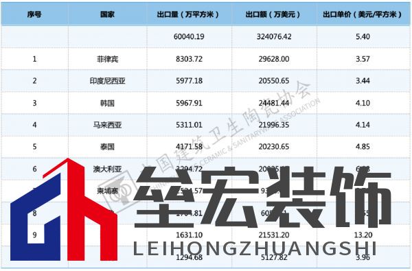 ??京東MALL四川首店即將試營業(yè) ??營業(yè)面積近4萬平方米的京東MALL四川首店落戶成都高新區(qū),將于3月15日開啟試營業(yè),并同期舉辦春季家博薈活動。據(jù)介紹,京東MALL成都店作為京東自營商業(yè)體,經(jīng)營200多個(gè)一線品牌,20多萬種商品。全渠道經(jīng)營家電、手機(jī)、電腦、數(shù)碼、清潔電器、生活電器、建材衛(wèi)浴、家具家居等品類,融入電競游戲、咖啡冰酒、美食烘焙、美妝個(gè)護(hù)、家場景、兒童樂園等體驗(yàn)業(yè)態(tài)。 ??2024年泰國陶衛(wèi)行業(yè)整體收入69億元 ??2024年,消費(fèi)需求疲軟與成本壓力成為泰國陶衛(wèi)行業(yè)共性挑戰(zhàn)。2024年,泰國墻地磚和銷售額皆有所下滑,整體收入325億泰銖(合人民幣69.8億元)。2024年,墻地磚產(chǎn)量為107030712.64平方米,總銷售為225億泰銖(合人民幣48億元);衛(wèi)生陶瓷銷量為5058169件,總銷售額99億泰銖(合人民幣21億元),其中馬桶銷量2863070件,銷售額75億泰銖(合人民幣16.1億元);小便斗銷售188194件,銷售額3.6億泰銖(合人民幣7813萬元);面盆銷售1905354件,銷售20億泰銖(合人民幣4.3億元)。 ??4家陶企向40家裝企提起訴訟 ??據(jù)業(yè)內(nèi)媒體不完全統(tǒng)計(jì),2024年以來,全國共有125家裝飾裝修公司宣告破產(chǎn)。與此同時(shí),受整裝、家裝渠道的影響,陶瓷企業(yè)與裝修公司的糾紛也在不斷上升。以4家陶瓷企業(yè)的訴訟情況為例,2024年以來,合計(jì)與40家裝修公司提起訴訟,均為買賣合同糾紛影響。 ??2024年我國陶瓷磚出口額暴跌33.26% ,創(chuàng)八年新低 ??據(jù)中國建筑衛(wèi)生陶瓷協(xié)會發(fā)布的數(shù)據(jù)顯示,2024年,我國陶瓷磚出口量維持在6.00億平方米,同比下降2.86%,出口單價(jià)同比下跌31.30%至5.40美元/平方米,導(dǎo)致出口額從48.56億美元降至32.41億美元,同比降幅達(dá)33.26%,為近八年新低。2024年,中國陶瓷磚出口前十大目的地國家/地區(qū)的出口總量為4.02億平方米,占總出口量的66.92%。2024年,廣東、福建、山東、遼寧、廣西為我國陶瓷磚出口前五大省份,合計(jì)出口量占比達(dá)91.93%,與2023年(92.51%)基本持平。與2023年相比,浙江跌出前五,廣西上升至第5位。