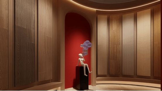 弧形選材區(qū)以立柱為中心,采用發(fā)散式弧形布局打破傳統(tǒng)展示邊界。鏡面天花與流暢的展線設(shè)計(jì)形成視覺延伸,讓空間在虛實(shí)交錯(cuò)中倍增開闊感。
